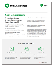 NGINX App Protect secures modern apps, containers, microservices and APIs against the latest threats. Prevent downtime, data theft and regulatory non-compliance with NGINX App Protect’s high-performance, scalable security solution.